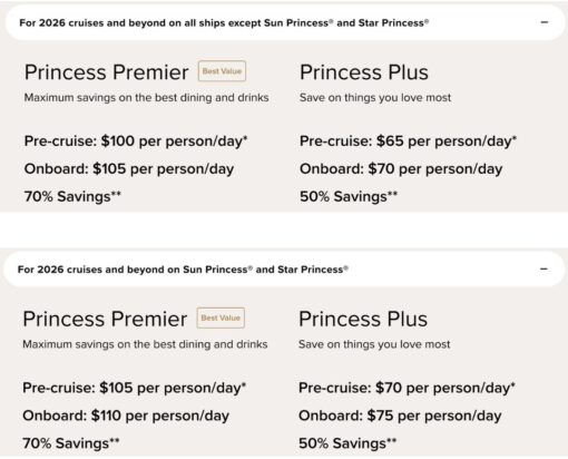 Starting in 2026, depending on the ship you are sailing, the price for the package changes. For this one (Dec. 2024) we bought Princess Plus for $60 per person/day. We never get those packages because it’s not like we drink every day, but we took advantage because of WiFi, it also included gratuity and “Drinks, Bottled Water and more. Wide selection of non-alcoholic soft drinks and premium Lavazza coffees, Cocktails, wine and beer up to $15 each. 25% off bottles of wine.”