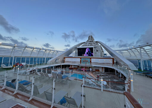 When we weren’t eating or exploring, we spent a lot of time just relaxing. We loved hanging out on Deck 15, near the aft pool — perfect for cocktails and ocean views — especially during sunset. There’s also a huge screen on Deck 16 where they show concerts and movies under the stars. When we arrived we watched a Rolling Stones concert out there and another time, while passing by, they were playing a Lady Gaga show.